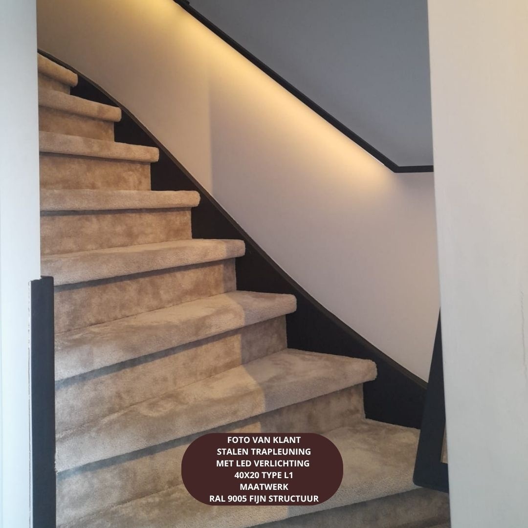De trapleuning wordt standaard geleverd in matzwart RAL 9005 fijnstructuur, een tijdloze kleur die uitstekend past bij moderne en industriële interieurs. Op aanvraag is de leuning verkrijgbaar in elke gewenste RAL-kleur. Ook het naadloos dichtlassen van de uiteinden behoort tot de mogelijkheden voor een nóg strakkere afwerking.