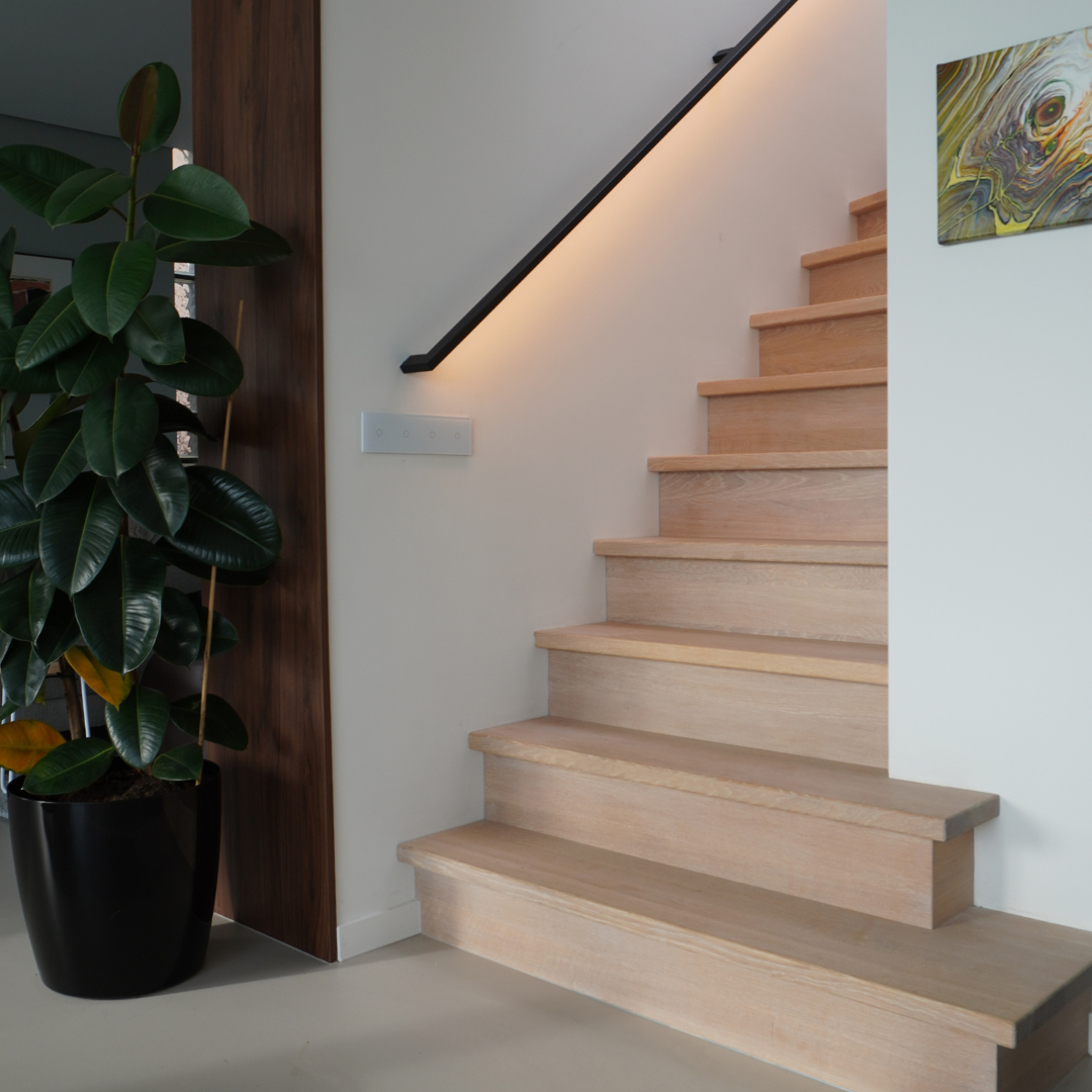 De in de onderzijde verwerkte warm witte LED-strip (2700K) zorgt voor sfeervolle verlichting en verhoogt de veiligheid op je trap. Deze nauwkeurig geïntegreerde lichtoplossing is het resultaat van slimme productontwikkeling door onze eigen vakmensen.