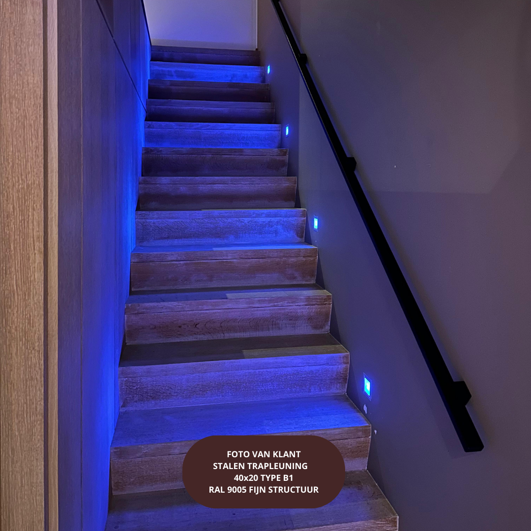 De trapleuning is standaard afgewerkt met een matzwarte poedercoating fijnstructuur (RAL 9005). Houd er rekening mee dat de kleurweergave op foto’s iets kan afwijken van de werkelijkheid, afhankelijk van lichtinval en scherminstellingen.