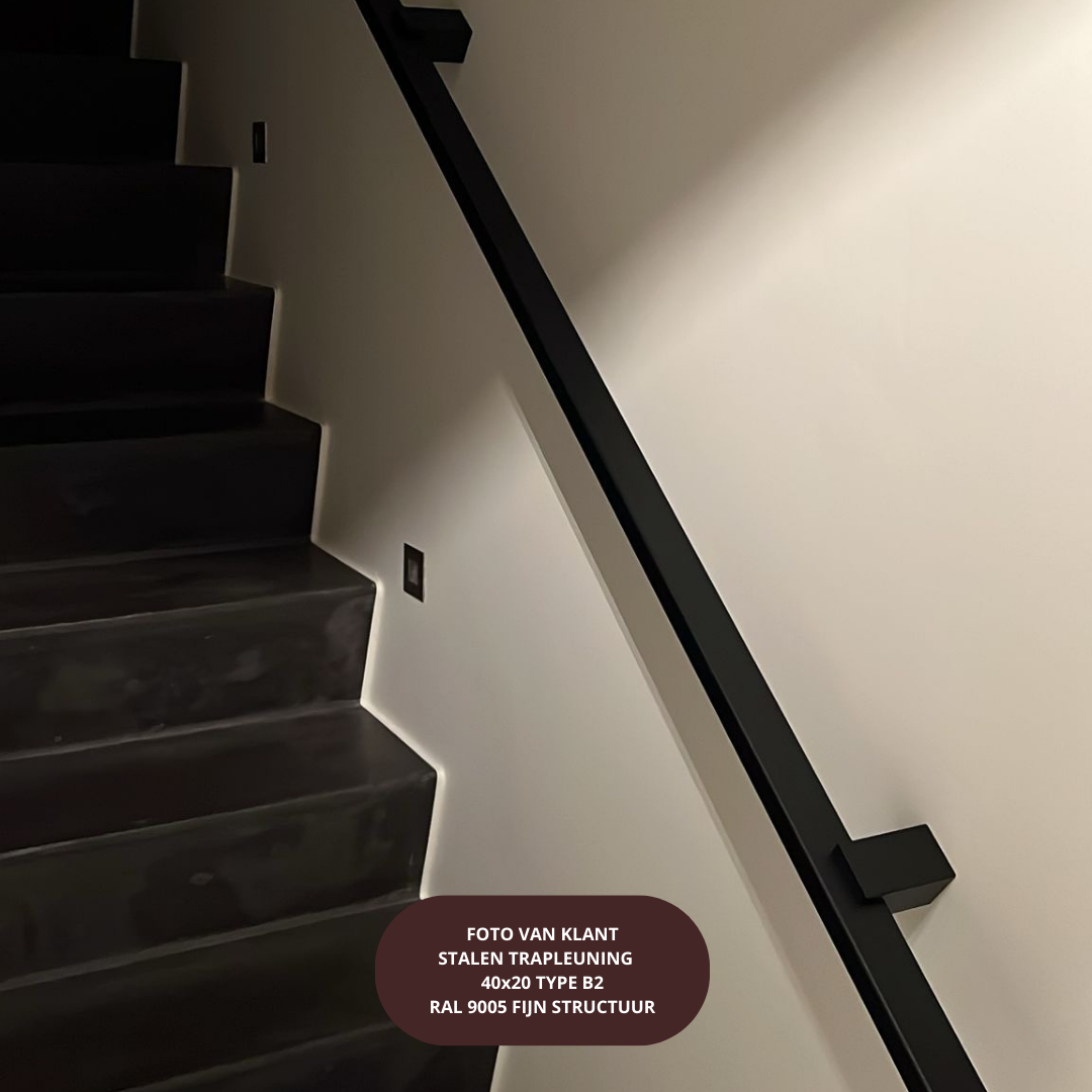 De trapleuning is standaard afgewerkt met een matzwarte poedercoating fijnstructuur (RAL 9005). Houd er rekening mee dat kleurweergave op foto’s kan afwijken van de werkelijkheid, afhankelijk van lichtinval en scherminstellingen.