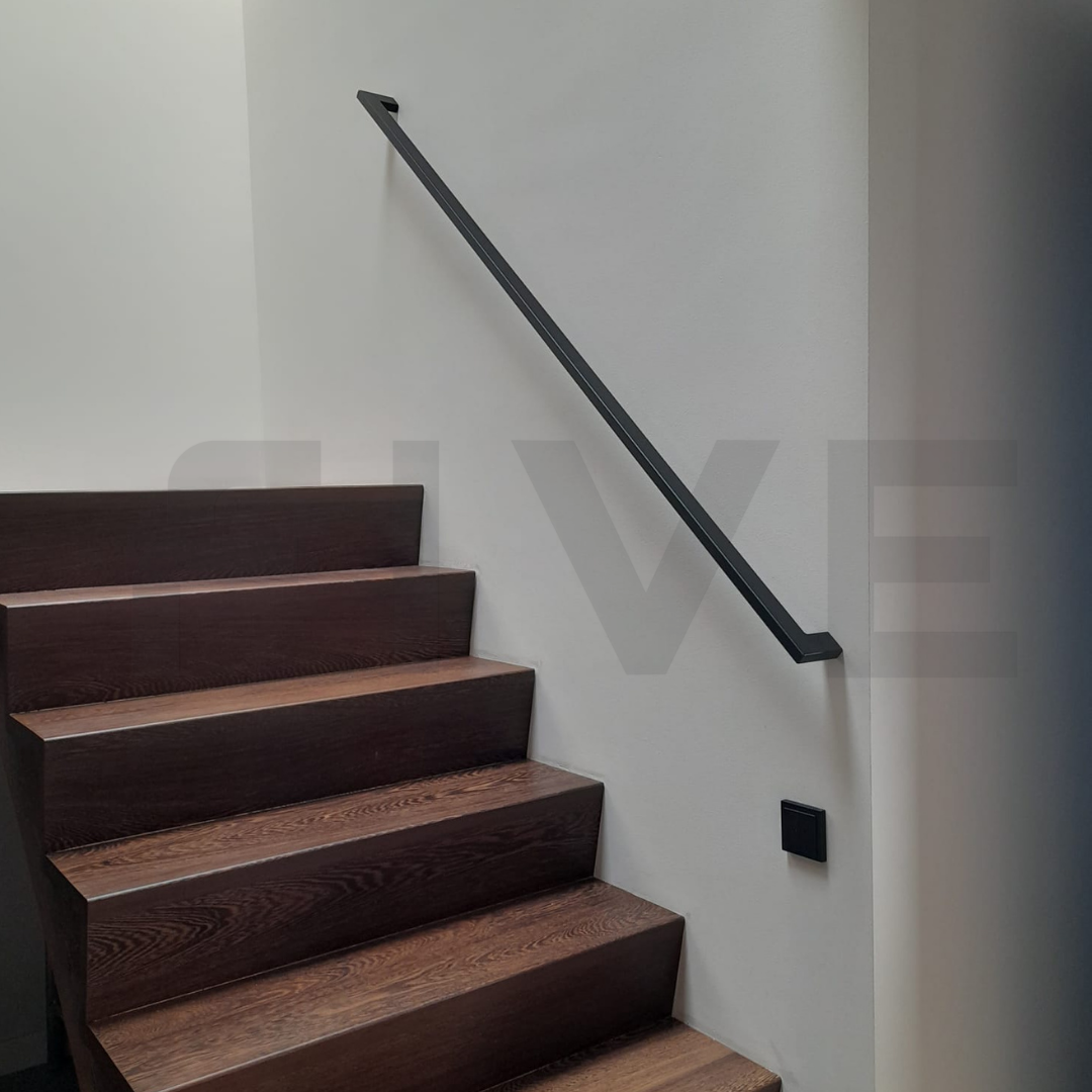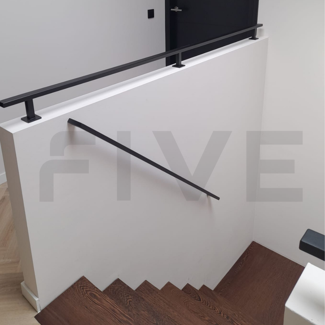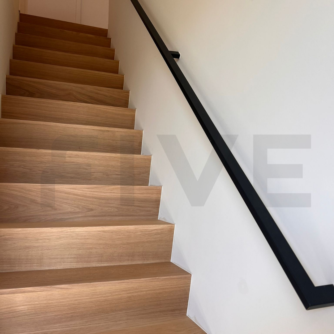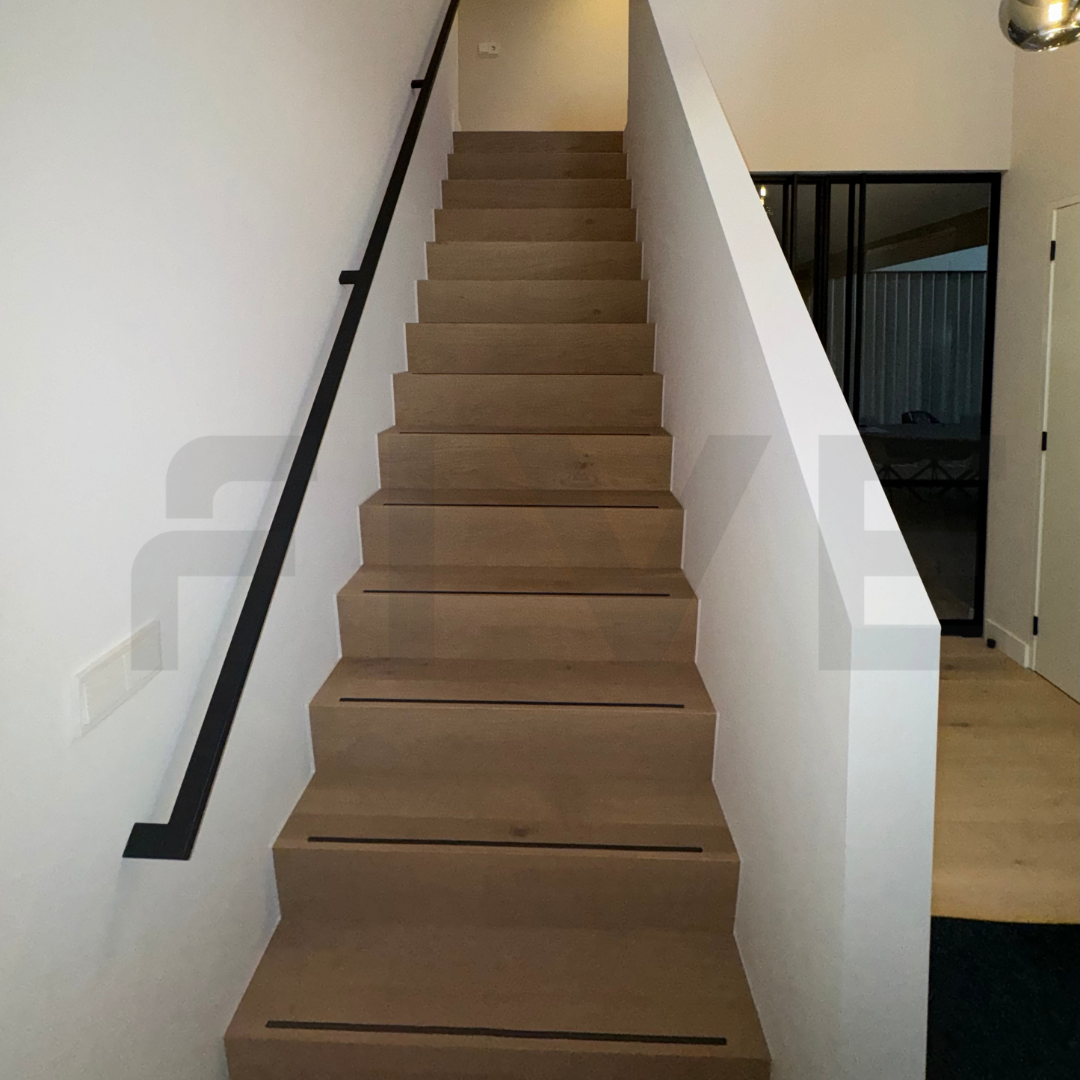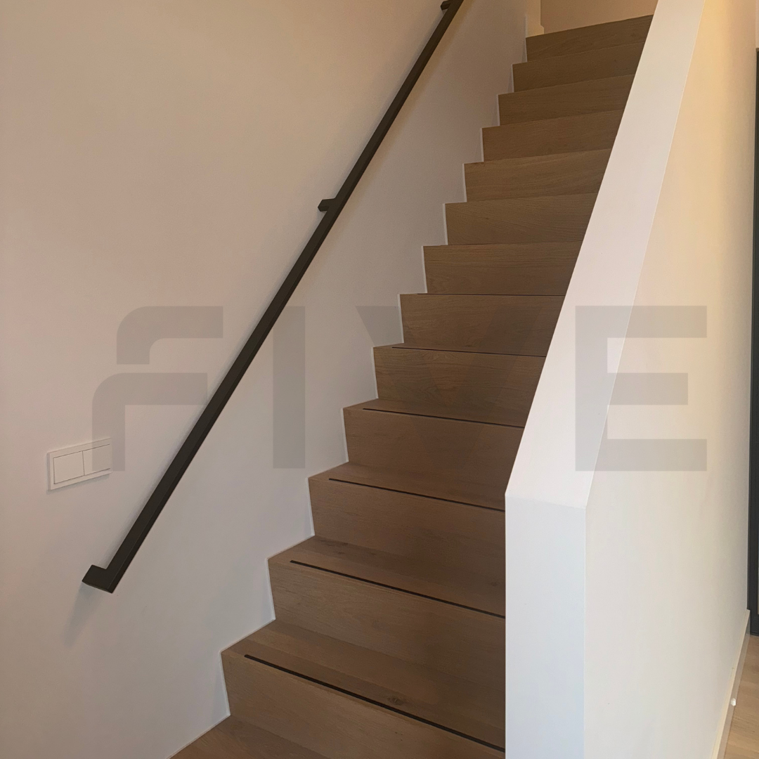 De leuning heeft een strak design met hoek gelast, en wordt bevestigd zonder traditionele leuninghouders. In plaats daarvan wordt de trapleuning op de muur gemonteerd met speciale blokjes waar de leuning overheen geschoven wordt en onder vastgezet. Dit zorgt voor een elegante, naadloze afwerking zonder zichtbare bevestigingen.