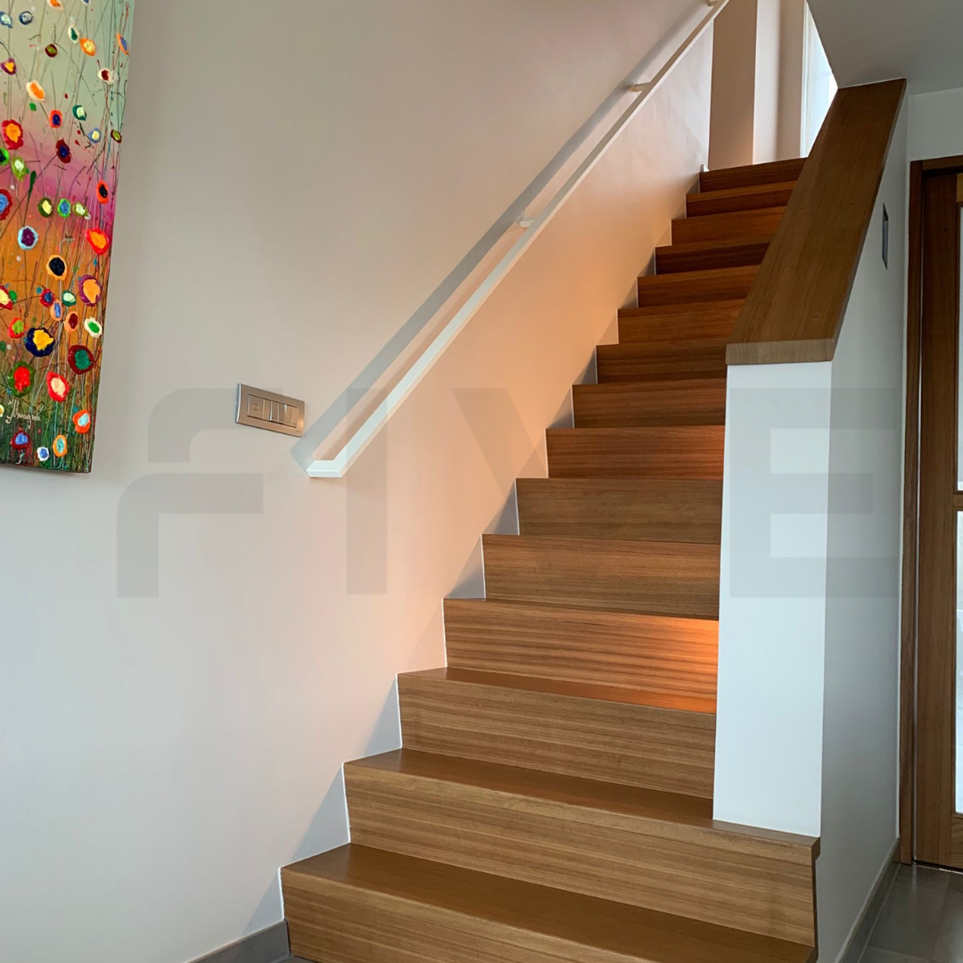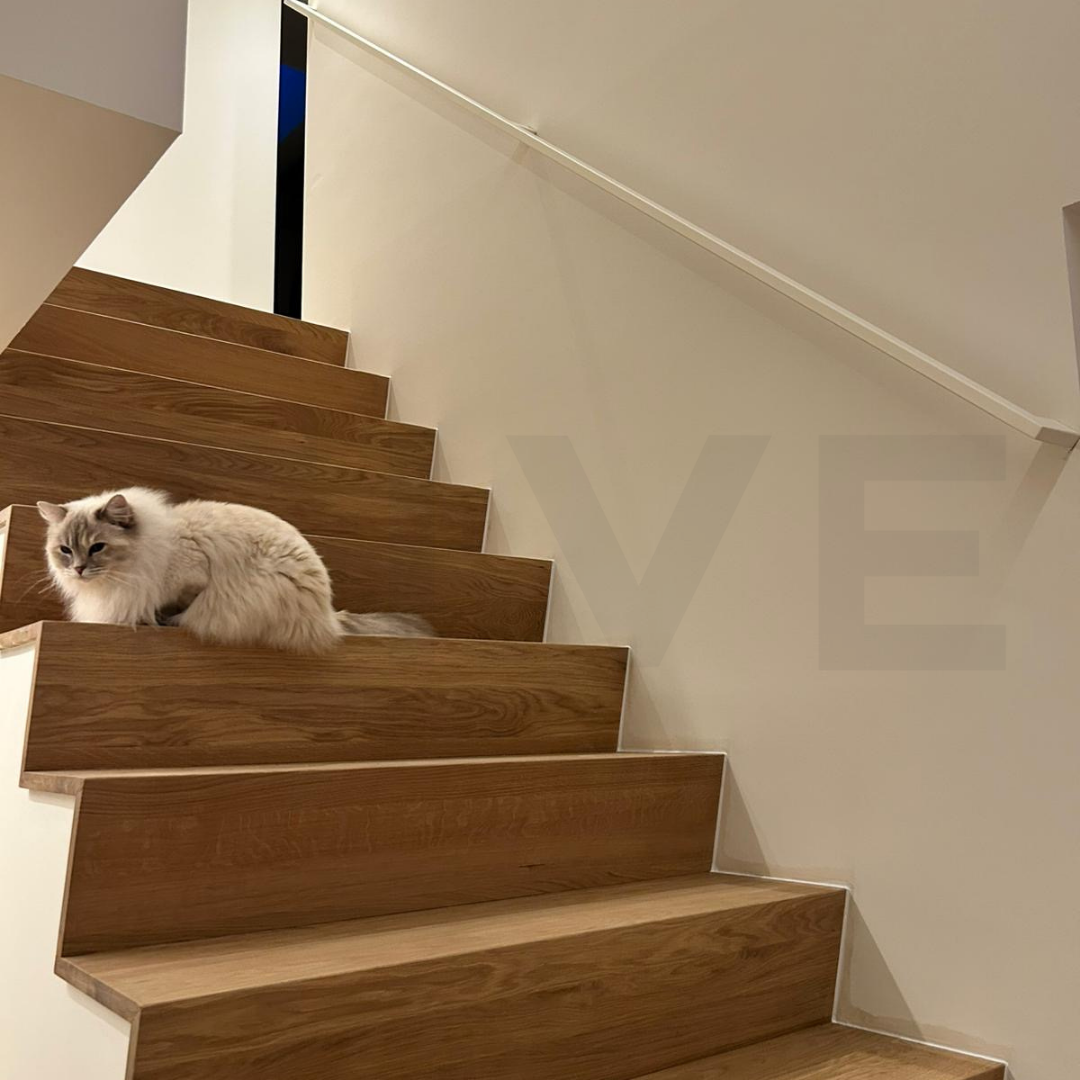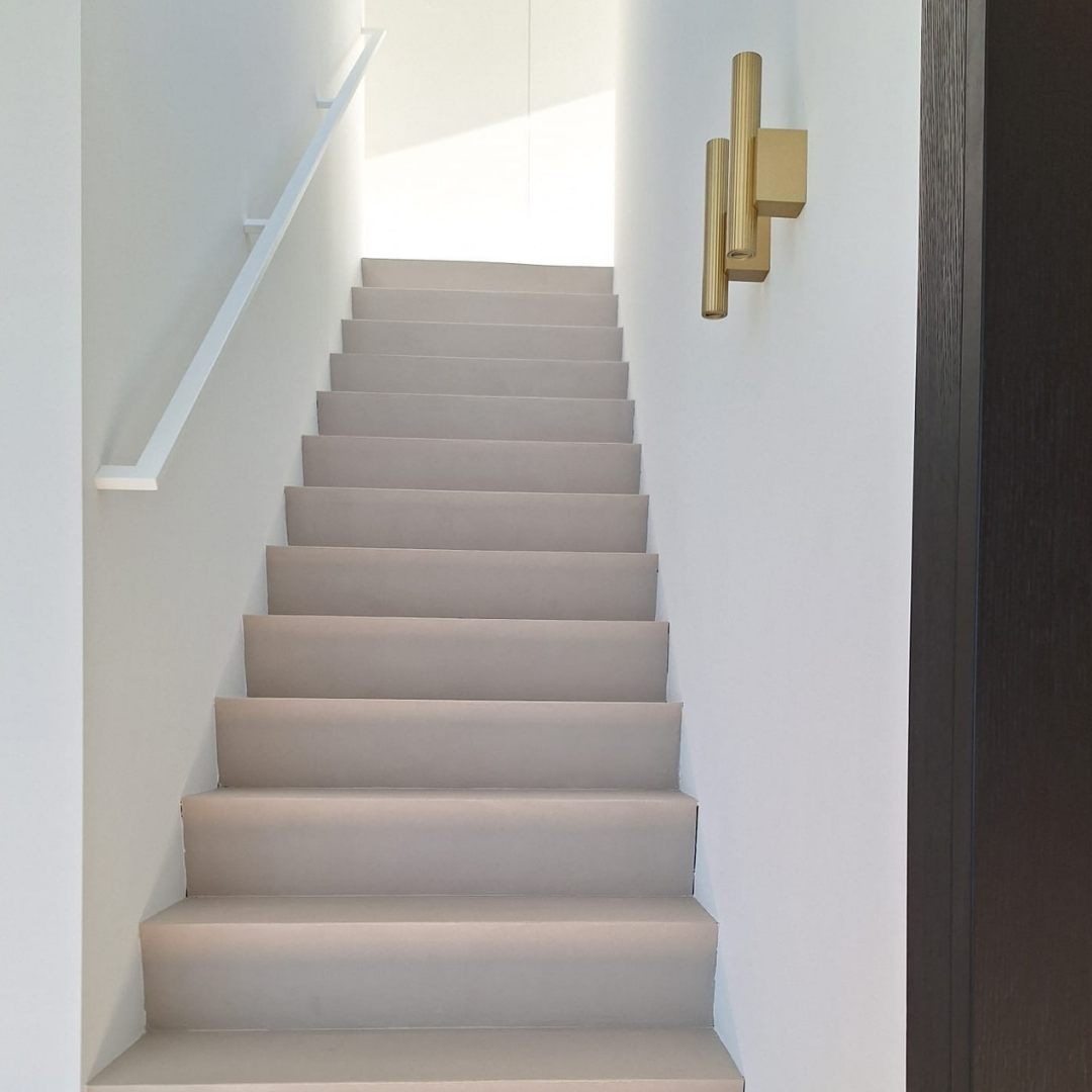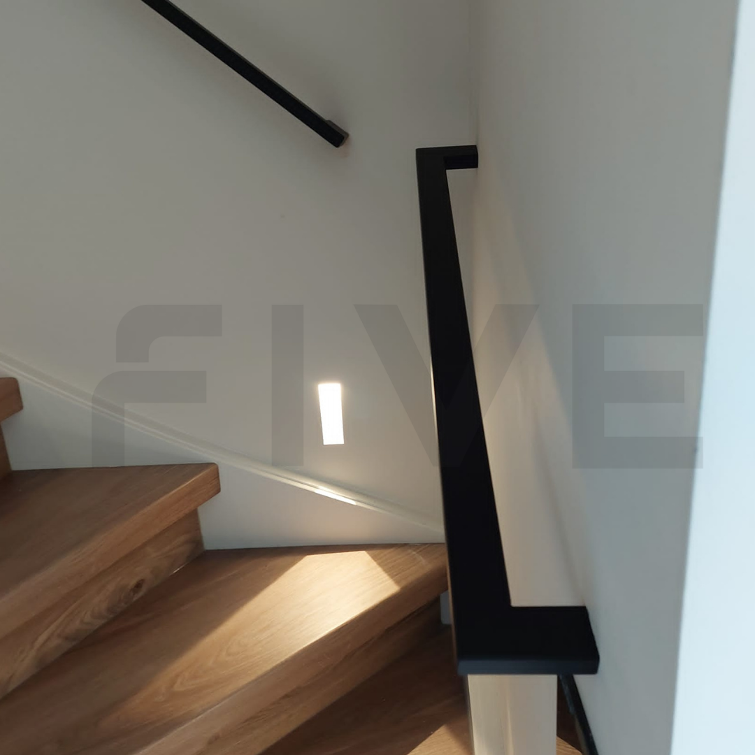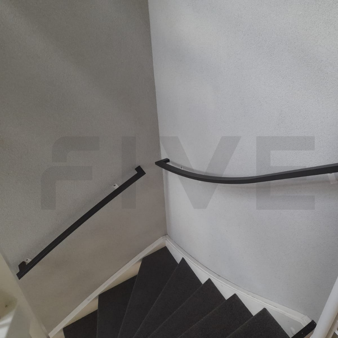 De leuning heeft een strak design met hoek gelast, en wordt bevestigd zonder traditionele leuninghouders. In plaats daarvan wordt de trapleuning op de muur gemonteerd met speciale blokjes waar de leuning overheen geschoven wordt en onder vastgezet. Dit zorgt voor een elegante, naadloze afwerking zonder zichtbare bevestigingen.