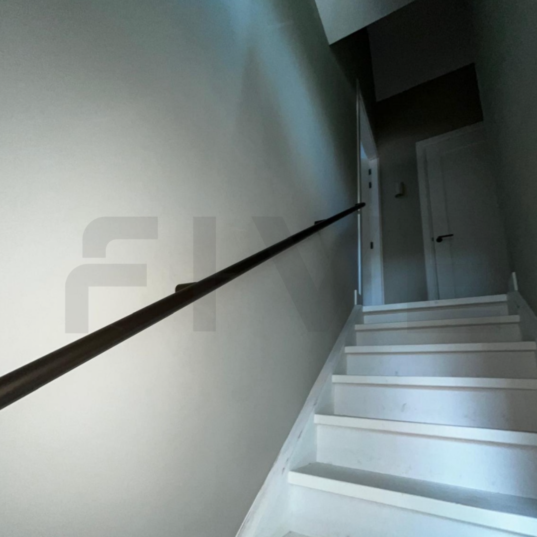 De trapleuning wordt aan de muur bevestigd met busjes voor blinde montage. Deze busjes worden eerst op de muur gemonteerd, waarna de trapleuning eroverheen wordt geschoven en aan de onderzijde wordt vastgezet met een klein, subtiel schroefje. Hierdoor ontstaat een strakke afwerking zonder zichtbare bevestigingen.