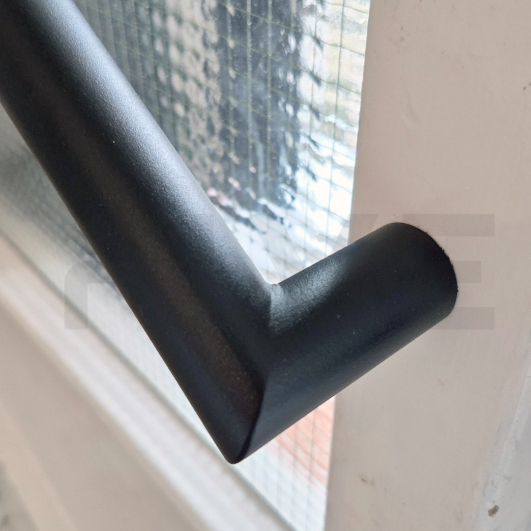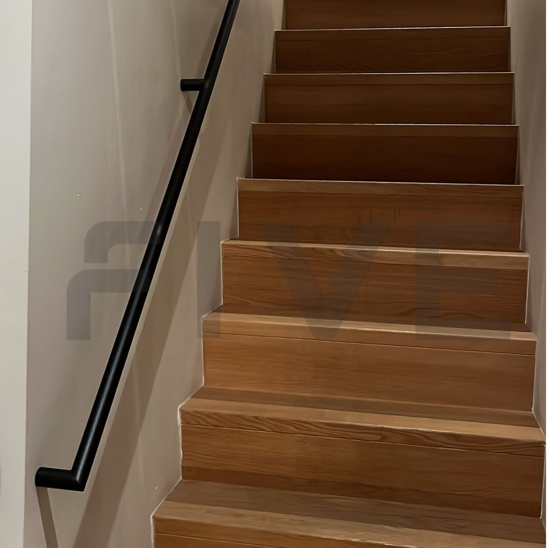 Deze trapleuning is vervaardigd uit hoogwaardig staal en afgewerkt met een duurzame, matzwarte poedercoating (RAL 9005 fijn structuur). Het ronde profiel van Ø30 mm zorgt voor een comfortabele grip en een rustige, tijdloze uitstraling. Als nieuwste model binnen de collectie van Five Stairs combineert deze leuning gebruiksgemak met een strak en modern design.