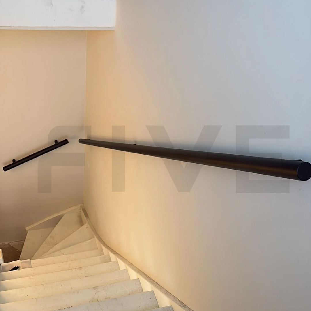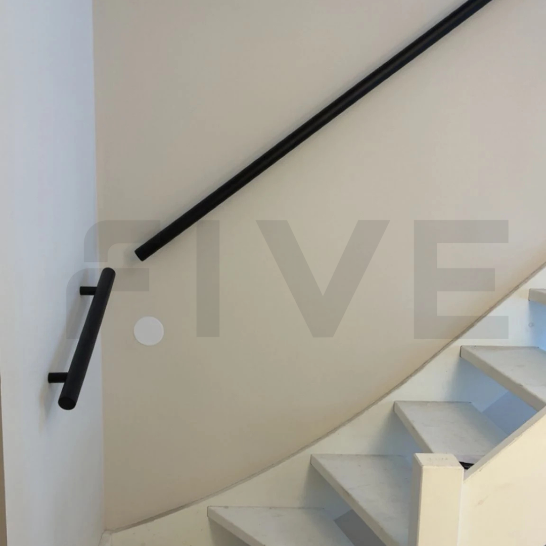Ben je op zoek naar een ronde stalen trapleuning met een extra strakke afwerking zonder zichtbare schroeven? Deze Ø40 mm trapleuning uit de collectie van Five Stairs is uitgevoerd met leuninghouders type R7: minimalistische montagebusjes die voor een volledig blinde bevestiging zorgen. Perfect voor wie houdt van een strak, naadloos en modern design.