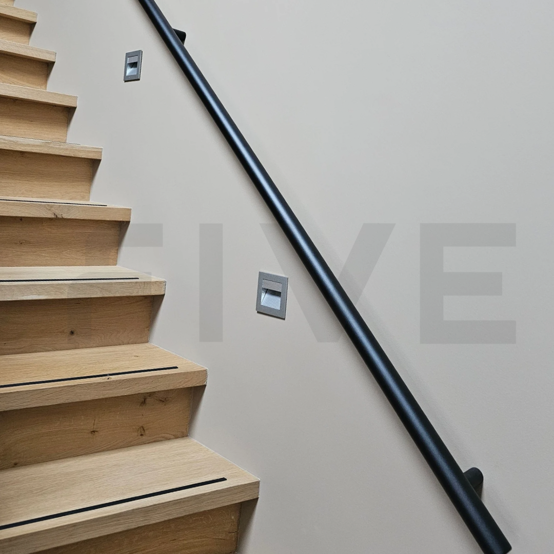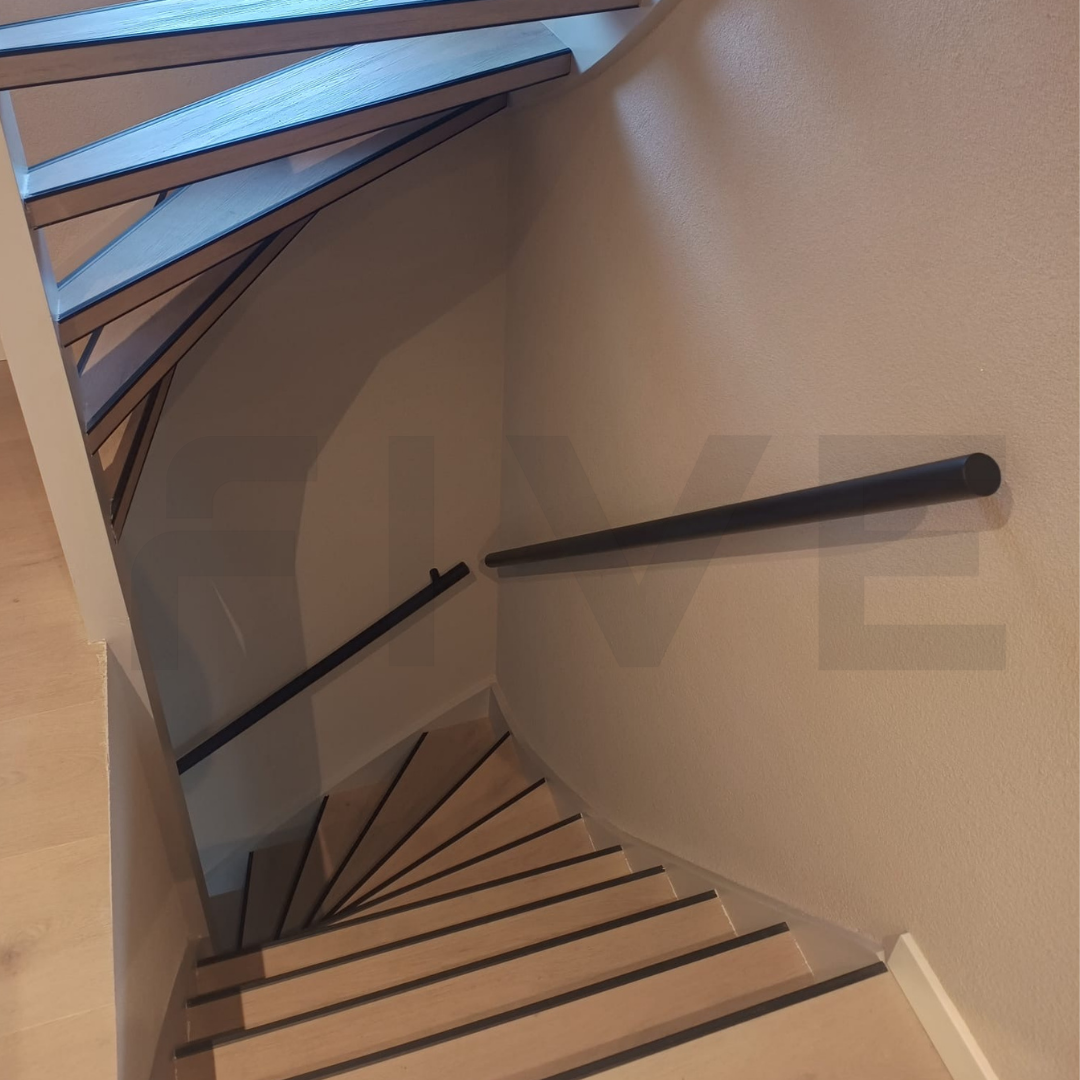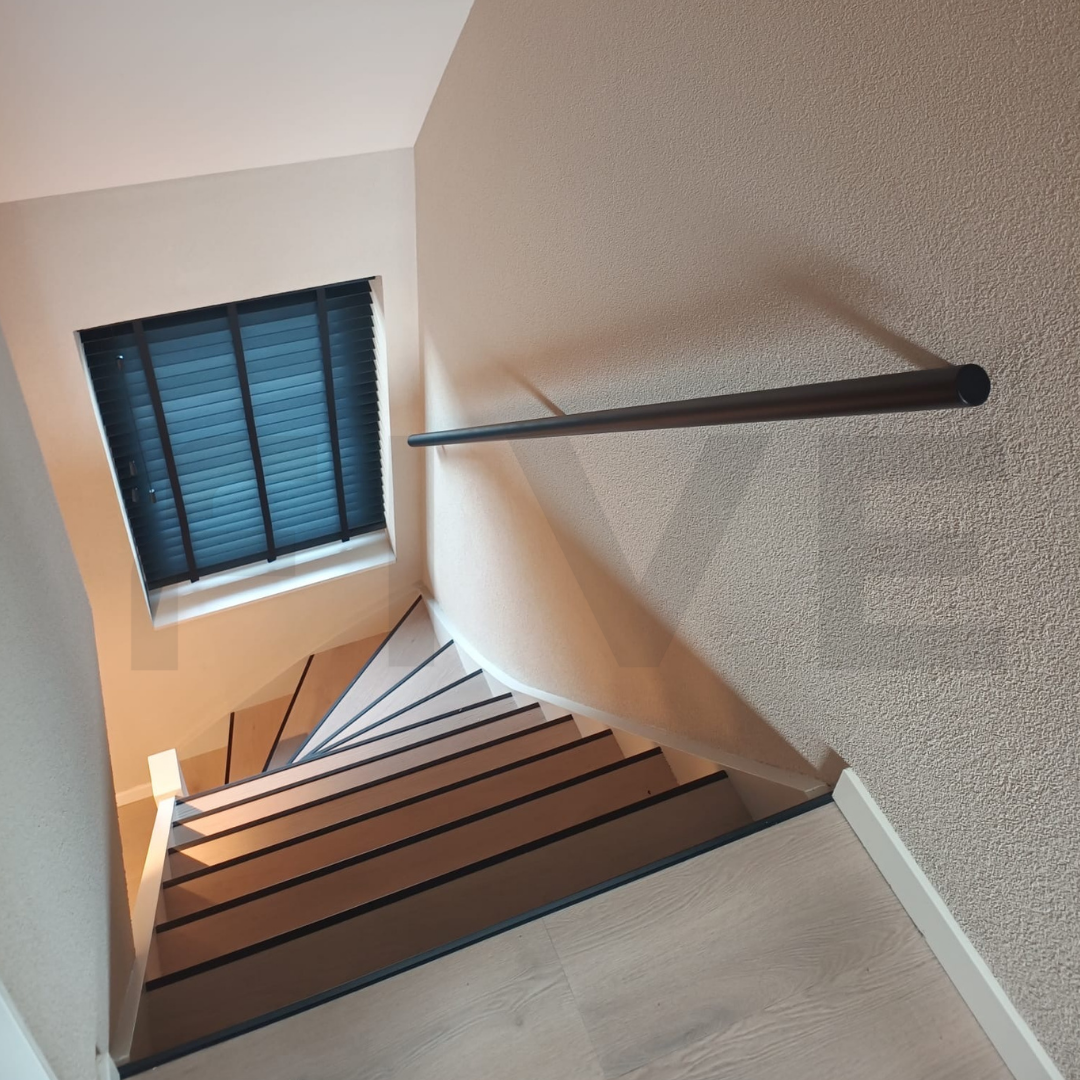 De trapleuning is standaard voorzien van een matzwarte poedercoating fijnstructuur (RAL 9005). Let op: de kleurweergave op foto's kan iets afwijken van de werkelijkheid door lichtinval of scherminstellingen.