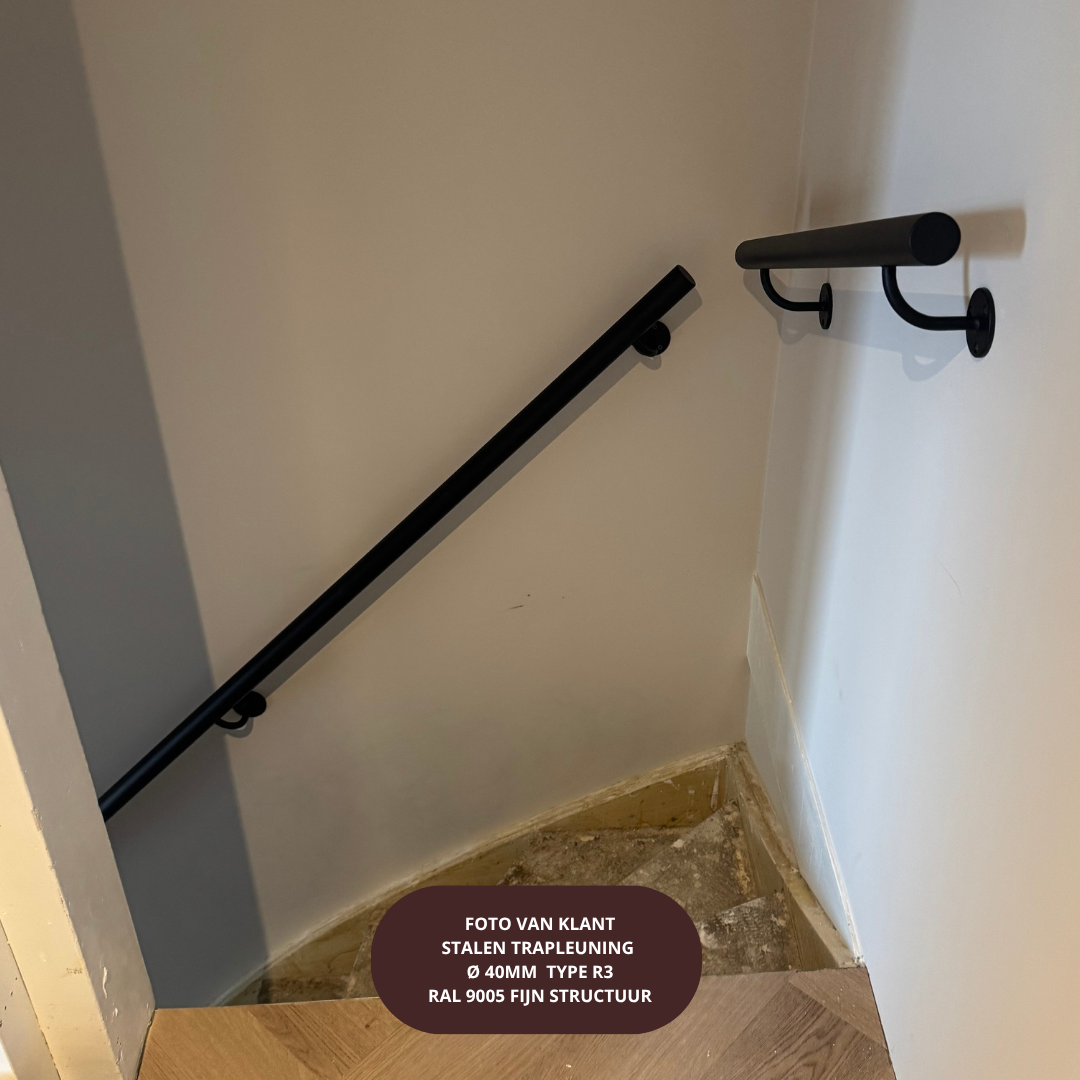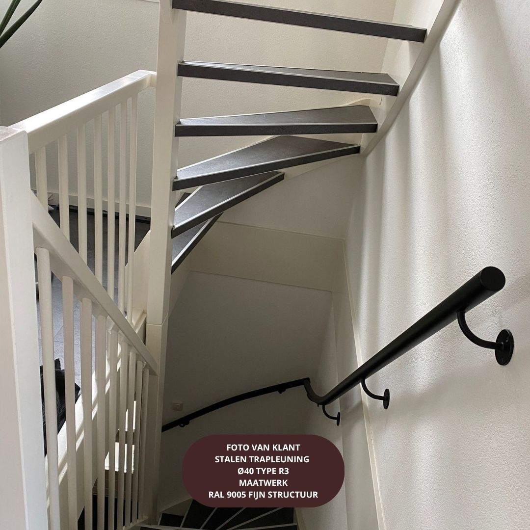De trapleuningen en aangelaste houders zijn afgewerkt in exact dezelfde fijne poedercoating in RAL 9005 zwart. Hierdoor ontstaat een volledig egale, matte afwerking zonder kleurverschillen. Houd er rekening mee dat de kleur op foto's soms glanzender kan overkomen dan in werkelijkheid. De werkelijke uitstraling is altijd mat zwart.