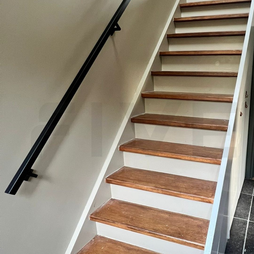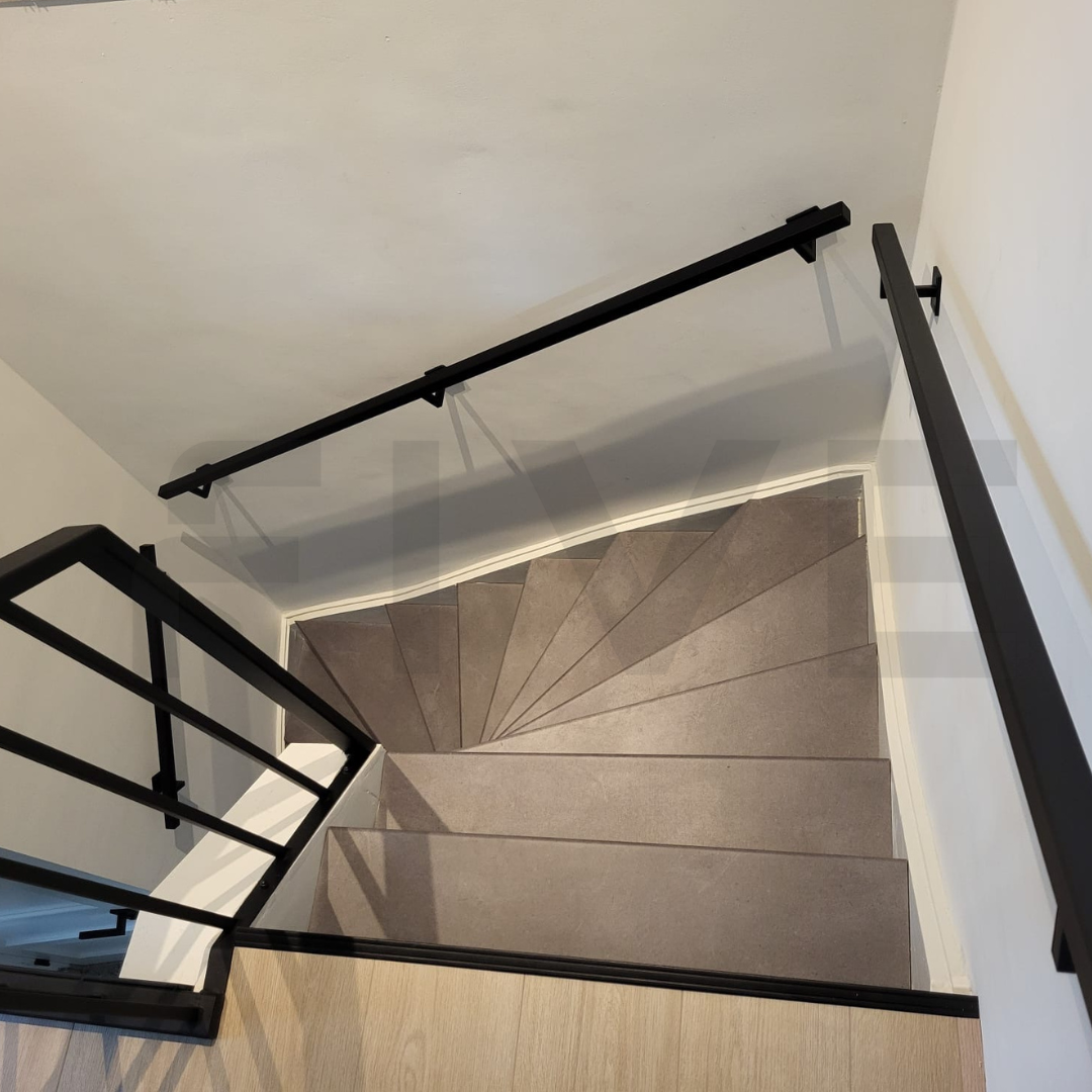 De trapleuningen en leuninghouders zijn afgewerkt in dezelfde matte fijn structuur poedercoating (RAL 9005 zwart). Houd er rekening mee dat de kleur op foto’s soms glanzender kan overkomen dan in werkelijkheid. De werkelijke uitstraling is altijd mat zwart en leuning en houders zijn in exact dezelfde kleur afgewerkt.